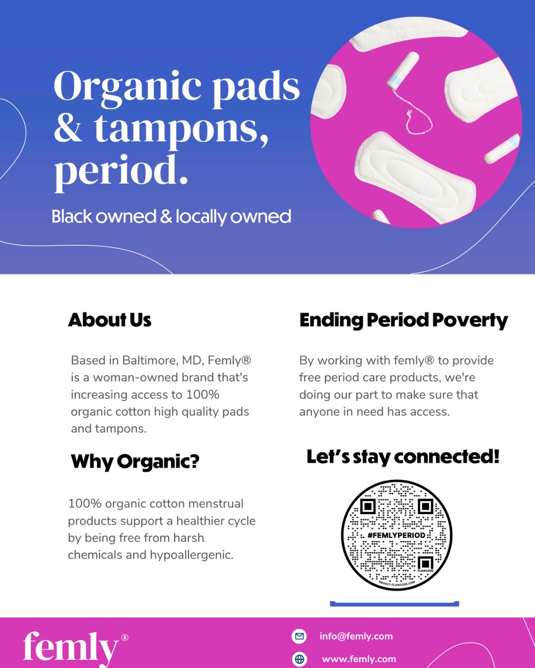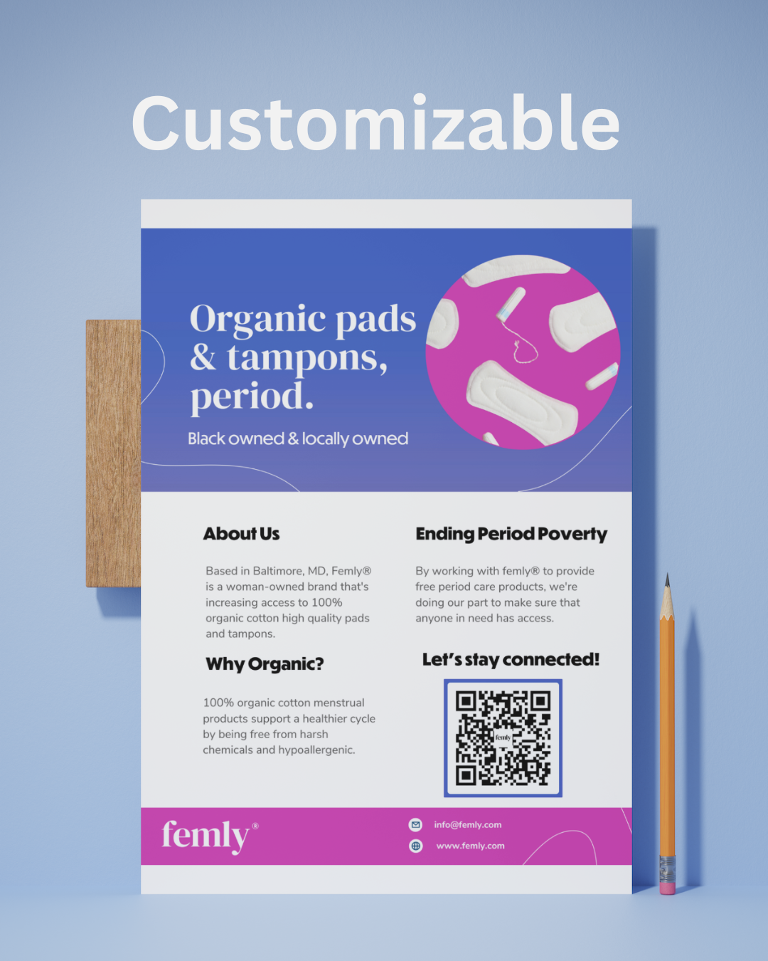 Whether you’re highlighting your organization’s commitment to menstrual equity, guiding visitors on sustainability practices, or celebrating your partnership with Femly, this display offers a polished, professional way to engage and inform your community.